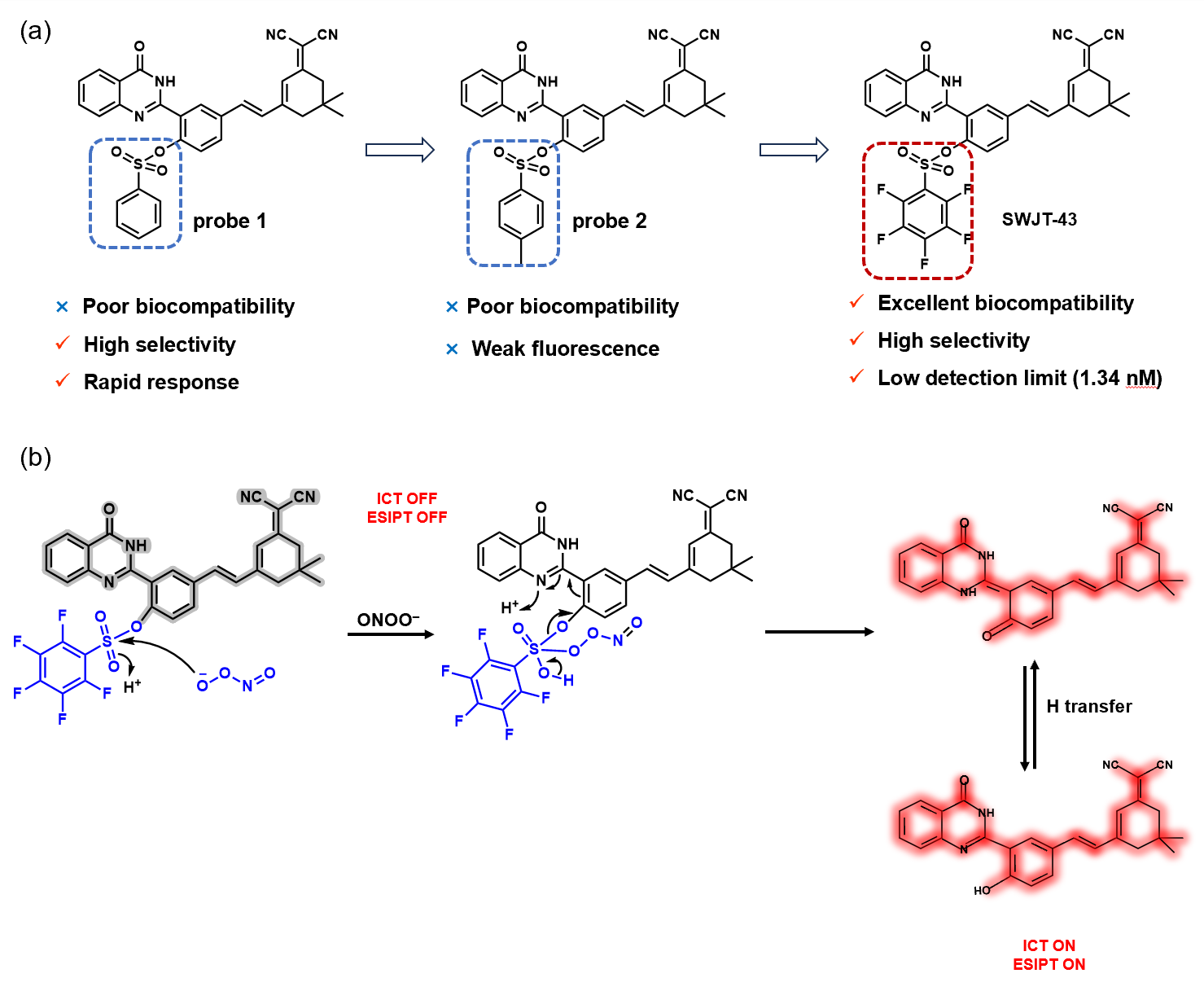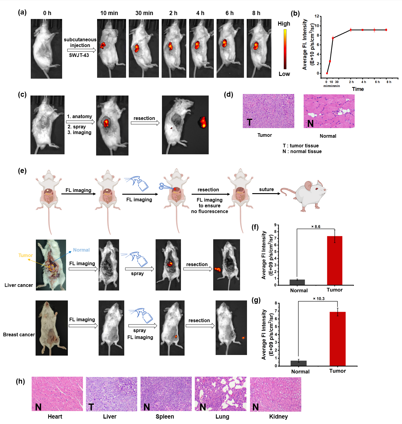 av直播王雅雯教授团队成功开发了一种双氰基异佛尔酮和2-(2′-羟基苯基)-4(3H)-喹唑啉酮(HPQ)的杂化骨架构建了一种可激活的近红外固态荧光探针(SWJT-43),具有高光稳定性和低背景干扰的特性。其通过特异性响应肿瘤微环境中过表达的过氧亚硝酸盐(ONOO⁻),实现对癌细胞的高灵敏度、高选择性检测,检测限低至1.10 nM。在实验中,SWJT-43成功应用于肝癌和乳腺癌细胞的长期原位成像,并能通过实时荧光差异快速区分癌变组织与正常组织。在动物模型中,该探针实现了对小鼠原位肝癌及乳腺癌肿瘤的特异性标记,为精准手术切除提供可靠的荧光导航,显著提升了手术的准确性。