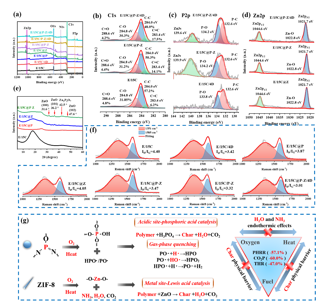 图4. (a) 不同复合材料燃烧后残炭的 XPS 光谱。如图所示,不同复合材料的 C 1 s、(c) P2p 和 (d) Zn2p 光谱。(e) E/15C、E/15C@P、E/15C@P 和 E/15C@P-Z 的 XRD 光谱。(f) 不同复合材料燃烧后残炭的拉曼光谱。(g) 气相和凝聚相中 PZS 和 ZIF-8 阻燃机理示意图。