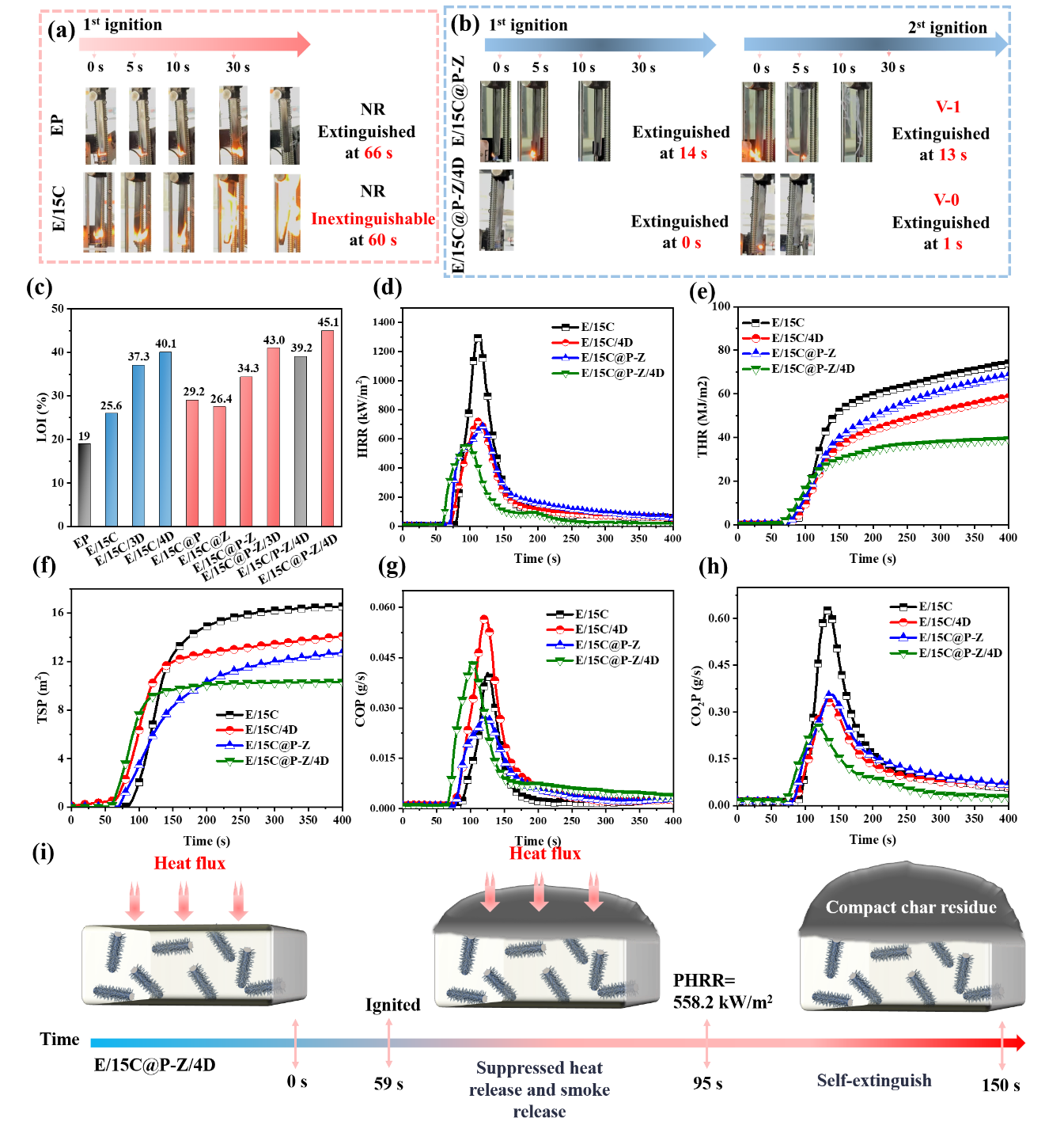 图3. (a) 及 (b) 显示 UL-94 测试中不同样本燃烧行为的数码照片;(c) 不同样本之间 LOI 的比较;在锥形量热仪测试期间获得的不同样品的 HRR 曲线、(e) THR 曲线、(f) TSP 曲线、(g) COP 曲线和 (h) CO2P 曲线;(i) E/15C@P-Z/4D 的燃烧示意图。