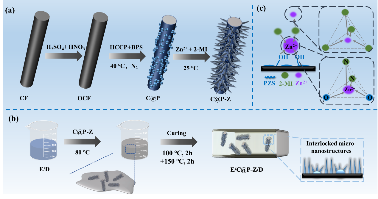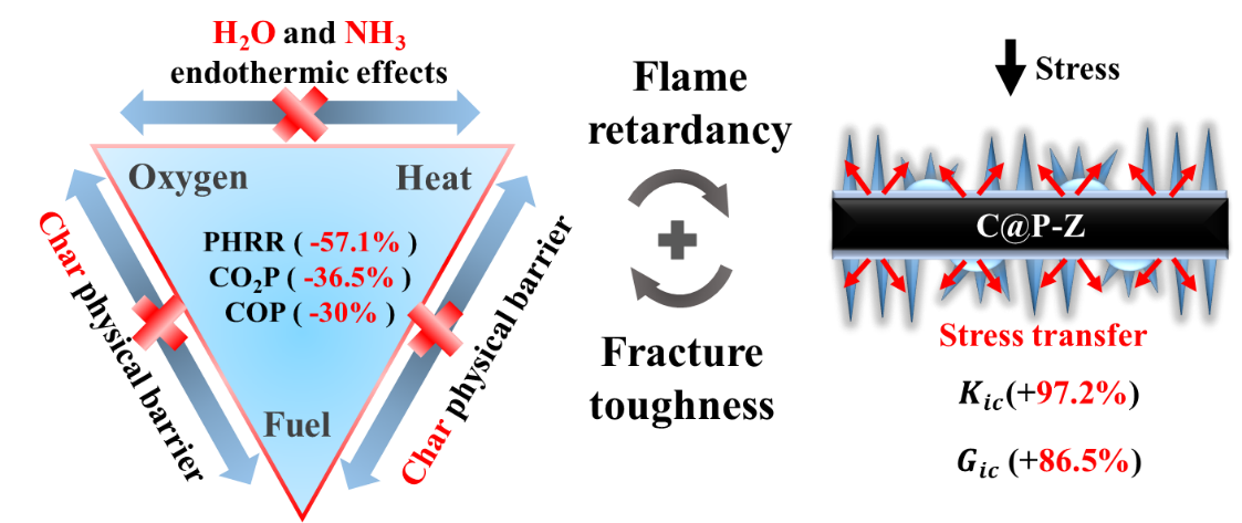 针对碳纤维(CF)增强环氧树脂复合材料因“烛芯效应”导致的阻燃性能差,以及现有界面改性方法在兼顾阻燃与力学性能方面存在的局限,本研究提出在CF表面协同组装聚磷腈(PZS)与金属有机框架材料(ZIF-8)的界面功能化策略,实现复合材料阻燃与力学性能的协同提升。结果表明,改性后复合材料的极限氧指数提升至45.1%,并通过UL-94 V-0等级;与未修饰体系相比,其峰值热释放率与总热释放量分别下降57.1%和47.0%,拉伸强度提高102.2%。机理研究表明,PZS/ZIF-8在燃烧过程中于界面处形成致密阻隔炭层,有效抑制CF的“烛芯效应”;同时,界面强氢键作用与粗糙表面引发的钉扎效应共同增强了复合材料的界面粘结。本研究为高性能-阻燃环氧复合材料的界面结构设计提供了新思路,在轨道交通、新能源汽车、航空航天等领域具有良好的应用潜力。