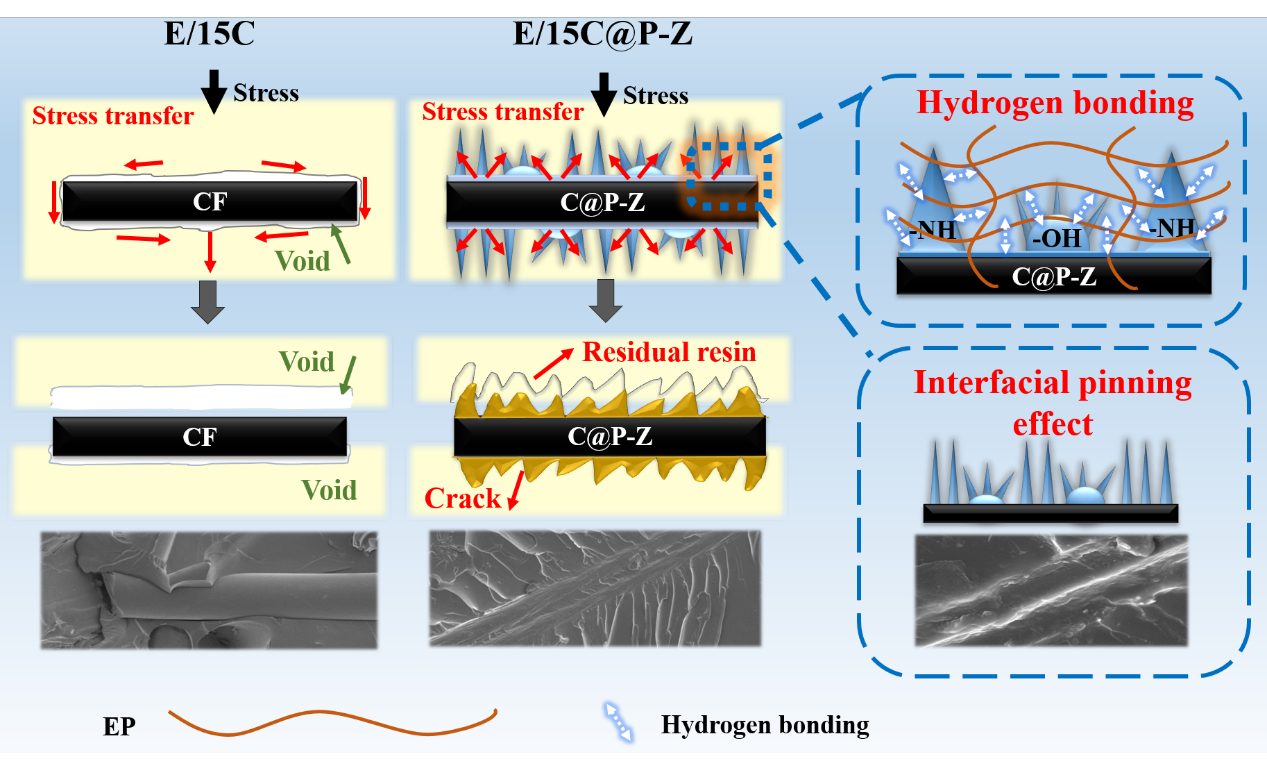 图7. E/15C 和 E/15C@P-Z 试样界面破坏模式和界面相互作用的示意图