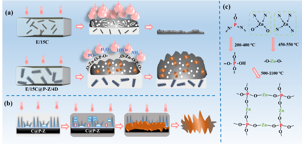 图 5.(a) E/15C 和 E/15C@P-Z/4D 的燃烧过程示意图;(b) 界面结构抑制 CF 的“灯芯效应”的过程;(c) E/15C@P-Z/4D 复合材料在燃烧过程中可能发生的反应。