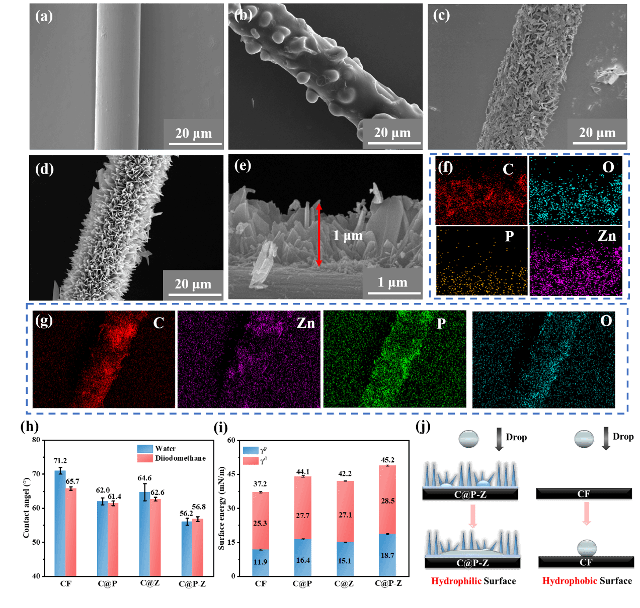 图2.(a) CF、(b) C@P、(c) C@Z、(d、e) C@P-Z 形态的 SEM 图像;C@P-Z 的 (f) 局部区域和 (g) 整个区域的 EDS 元素映射图像(其中 C 代表碳,O 代表氧,P 代表磷,Zn 代表锌);(h) 接触角,(i) 如图所示,未经处理的 CF 和改性纤维的表面能;(j)CF 和 C@P-Z 之间的接触角测量示意图