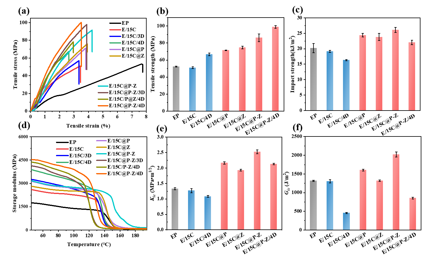 图6. 代表性复合材料样品的机械性能。(a) 应力-应变曲线,(b)拉伸强度,(c)无缺口 Izod 冲击强度,(d) 通过 DMA 测量得到的储能模量,(e)