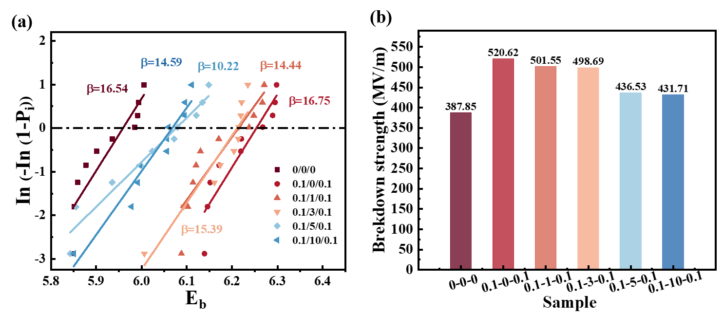 图4. (a)击穿强度的威布尔分布分析;(b)不同夹层结构复合膜的特征击穿强度比较。