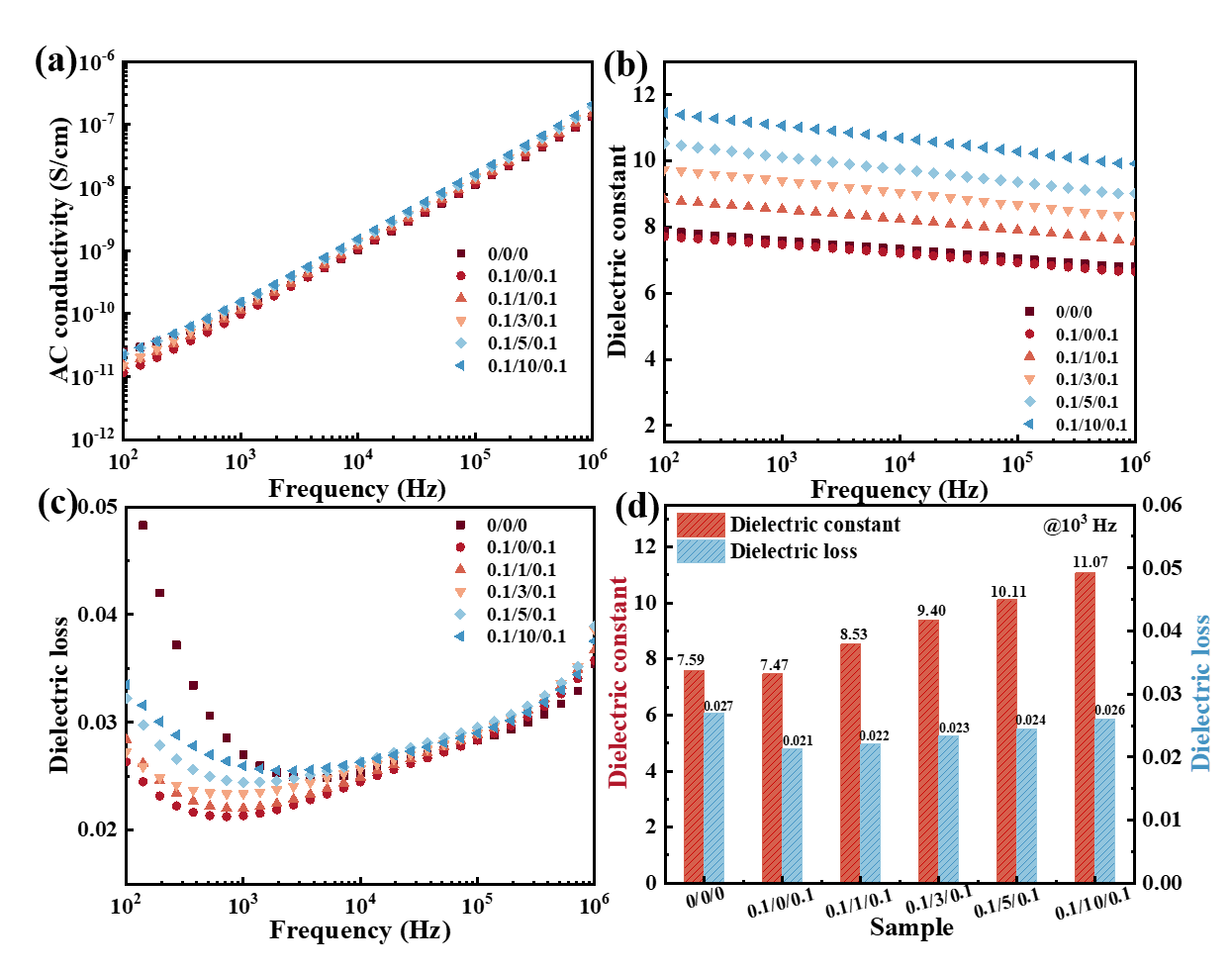 图3. 三明治结构薄膜的电学和介电特性:(a)交流电导率;(b)