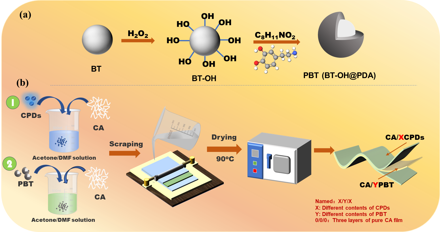 图1. (a) PBT和 (b) 三明治结构复合薄膜的制作过程示意图。