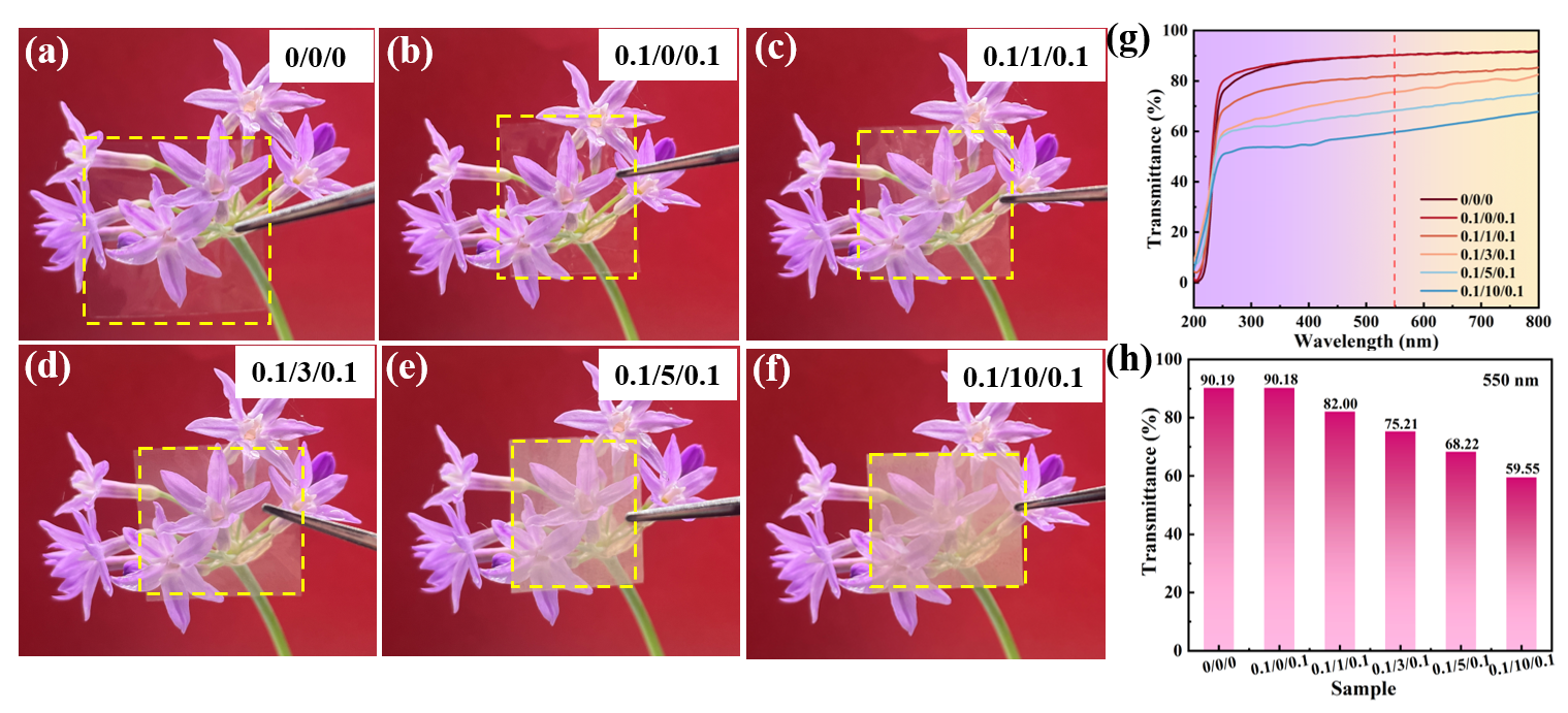 图2. (a-f) 显示不同夹层结构薄膜透明度的数码照片;(g)三明治结构薄膜的紫外-可见透射光谱;(h) 550 nm处的透射率。复合膜的厚度约为15 μm。