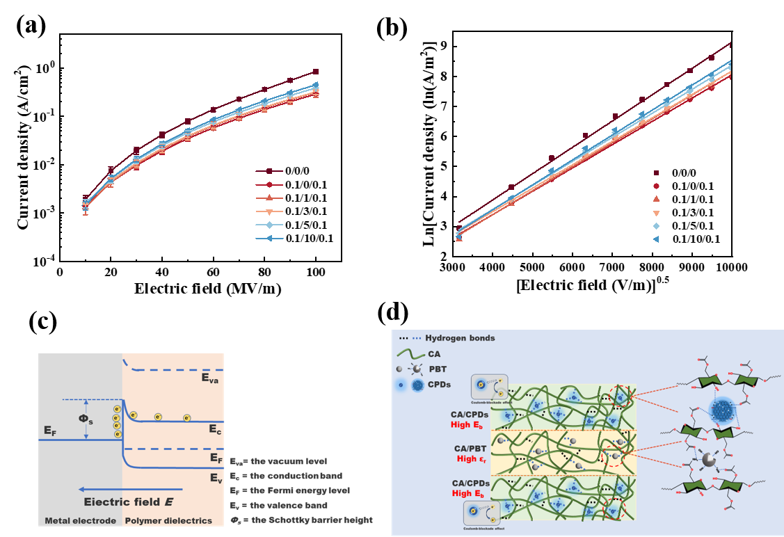 图5. (a)不同夹层结构复合膜的J-E曲线和 (b)对应的Schottky发射拟合结果;(c)肖特基发射图;(d) CPDs和PBT在CA矩阵中的作用示意图。
