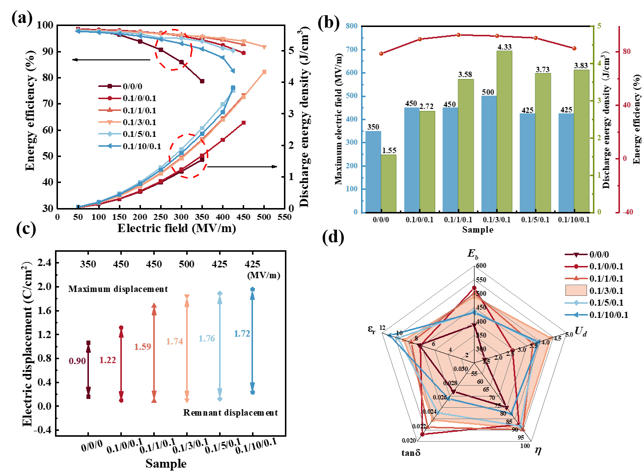 的比较;(c)净极化参数;(d)电介质性能参数的雷达图。